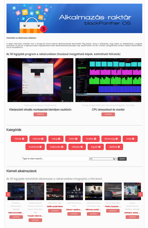 A raktár hasonlóan működik mint az Android alkalmazásokat felvonultató Play-áruház. Annyi a különbség, hogy ebben az adatbázisban a legjobb, minősített, és persze a leghasznosabb megoldásokat kínáló alkalmazásokat jelenítjük meg, blackPanther OS-hez. Számos egyedi program mellett kivétel nélkül magyar leírást, útmutatót és dokumentációt is találsz mindegyikhez.