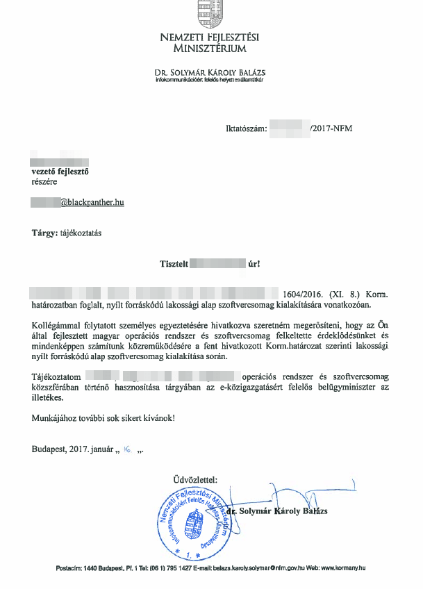 Az Államtitkár Úr (2017.01.17.-i levelében) csak annyit írt, hogy az osztályvezetőt bízta meg ezzel a feladattal, aki láthatóan mellébeszélt, és a végén még a Belügyminisztériumhoz is átirányított. Ezzel párhuzamosan megtudtuk, hogy az elmúlt években a kormányzattal szorosan összefonódó FSF.hu-tól, Kelemen Gábor (Gnome/Ubuntu honosító/FSF aktivista – videó) a testvére közreműködésével állást kapott akkor a Nemzeti Fejlesztésii Minsztérium soraiban.