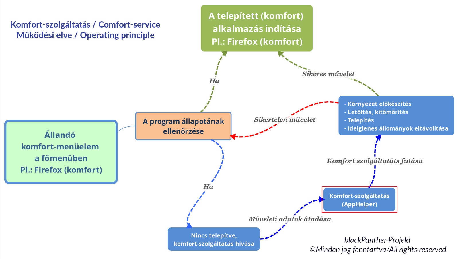 A Komfort-szolgáltatás (App-Helper Comfort Service) a blackPanther-Projekt saját fejlesztéseinek egyike, és az Alkalmazás-Segítő új beépített funkcióját tükrözi. A komfort szolgáltatás lehetővé teszi, hogy egy megbízható külső forrásból egyetlen kattintással telepítsük, majd egyszerűen használjuk a kiválasztott ‘komfort-alkalmazást’. A komfort-szolgáltatás célja kimondottan az, hogy komfortossá tegyük a grafikus környezet használatát, és az összes műveletet, parancsok kiadása nélkül végrehajtsa a keretrendszer teljesen automatikusan.